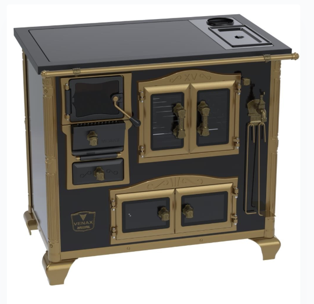 Fogão a Lenha Nº2 Imperador Vitreo Premium, Chapa Vitrocerâmica com Moldura em Aço na Cor Preta, com Saída para Chaminé na Chapa, Caldeira em Alumínio Teflonada, Corpo em Chapa QCV Esmaltada, Tranca na Porta da Fornalha, Porta Dupla no Forno e na Estufa. Portas da Fornalha, Forno e Estufa de Vidro. Puxadores, Guarnições, Cantoneiras e Suportes dos Varões Estilo Século XV, com Acabamento em Tom Ouro Velho.